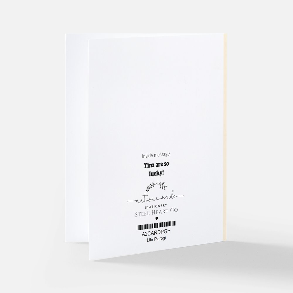Welcome a brand-new little one with the “Precious Little Pierogi” Baby Card. Featuring a charming pierogi illustration and a playful nod to Pittsburgh pride, this baby greeting card is a sweet way to celebrate a newborn or growing family. The warm, simple design makes it a keepsake parents will smile at long after the card is opened.