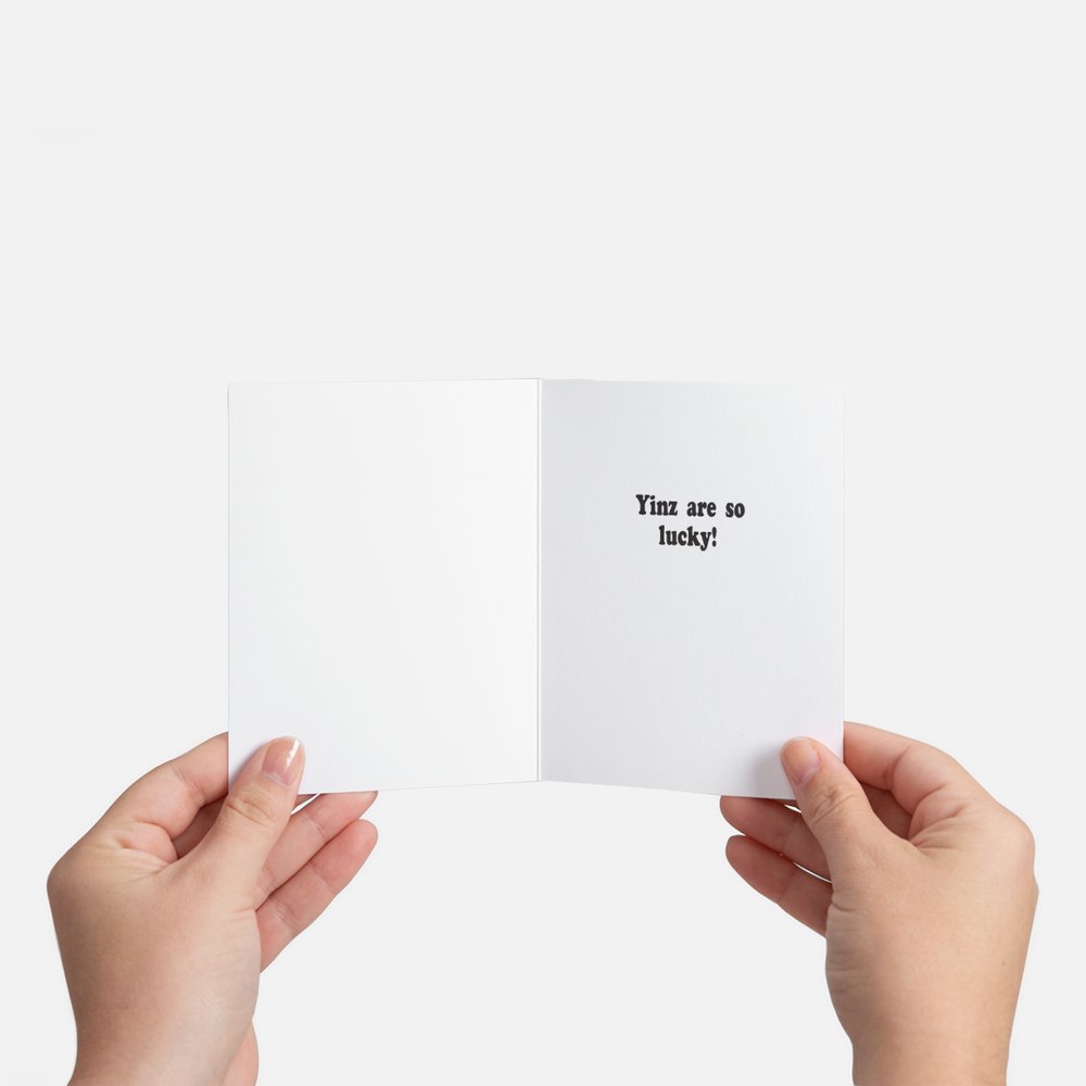 Perfect for baby showers, newborn gifts, or welcoming a baby born to Pittsburgh-loving parents, this Pittsburgh-themed baby card adds a thoughtful and local touch. Inside message reads, “Yinz are so lucky!” with space for a personal note.